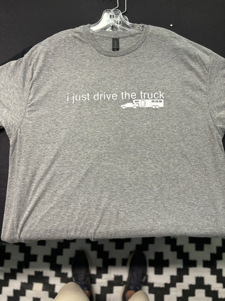 "i just drive the truck" - white wording on a Heather Gray, super soft, premium poly cotton blend fabric T-shirt.