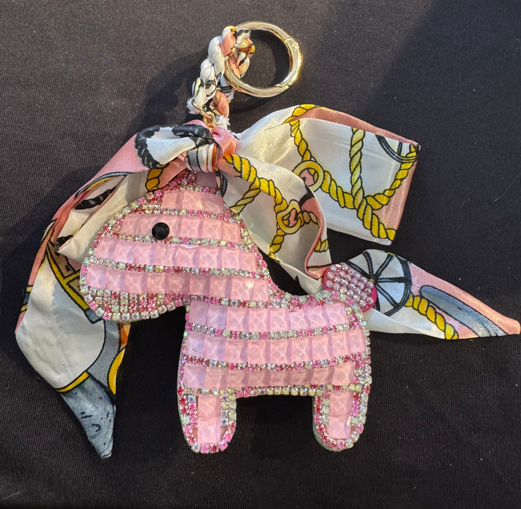 A big hit at the horse shows! These high-quality bag charms made from vegan leather, with a beautiful scarf tie and chunky crystals, are the perfect way to add a touch of equestrian style to your handbags, totes, backpacks, or even rear-view mirrors. Colors available constantly changing.